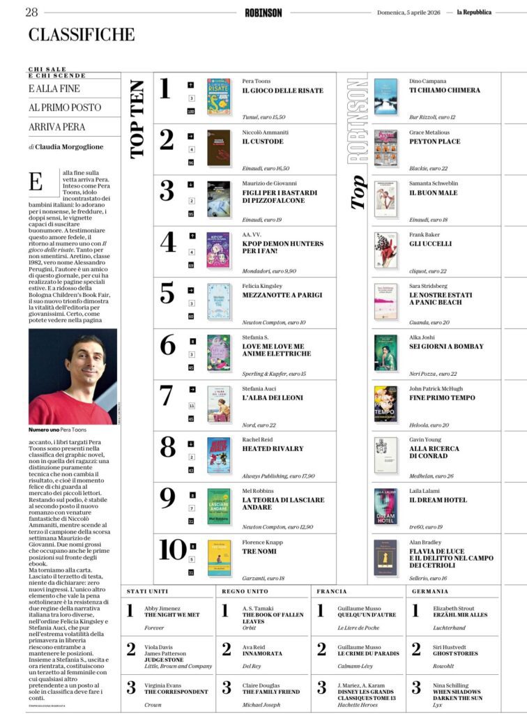 Il gioco delle risate (Tunué, 2026) di PERA TOONS è primo In Italia nella classifica generale dei libri più venduti della settimana 23-29 marzo. A poco più di quindici giorni dall’uscita domina la top ten insieme ai grandi nomi della letteratura italiana e internazionale. Un risultato eccezionale per un libro destinato a un pubblico di bambini e bambine, a coronamento di un percorso straordinario iniziato con il suo best seller Ridi che è meglio, il fumetto più venduto nella storia da quando esistono le rilevazioni GFK (2008).